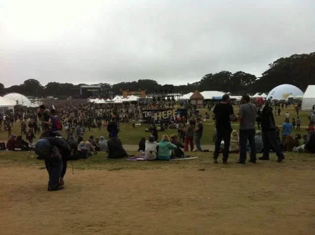 Two a.m. Sunday morning. That Tent. Billy Idol has just finished playing. Most of the crowd is staying exactly where they are, holding fast to their good spots. It's been a strange Saturday evening. The cancellation of Mumford and Sons cast a bit of a pall on the festival, which, by and large, is vocal about its dissatisfaction with the replacement act of Jack Johnson. Lots of bitter, sarcastic jokes being cracked. Lots of disappointed Mumford fans. There's been a weird hole in the evening where the much-anticipated headliner should have been. People have been wandering, ambivalent about what they wanted to do or see instead. Energy has been low for a couple of hours, as clusters of bummed out fans trickle around the festival grounds in search of something to keep them going. But now the buzz and hum are starting to build again. Empire of the Sun is about to start, and the crowd is fidgety with excitement, despite the late hour, and despite the fact that they're going on nearly half an hour late.