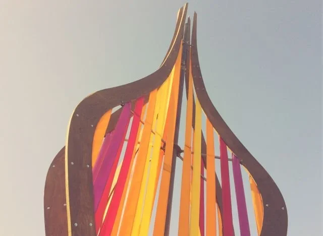 The three of us grab a patch of grass near a hip hop show. We sit only long enough to share a truly wretched soft pretzel and a handful of shrooms before we get up and wander the grounds, soaking up the chill sunset vibes of the festival. They're not attached to anything until the classic rock shows starts a few hours later, and I'm content to meander and take in the sights while the mushrooms gently, slowly curl their fingers around my senses. I let my gaze linger on things as we pass. Colorful clothes, face paint, signage, the oversized grotesque statues spiked in the ground. Everything has the potential to be a playground for my mind. I loosen my thoughts and relax my body into the drugs, letting them take me where they will.