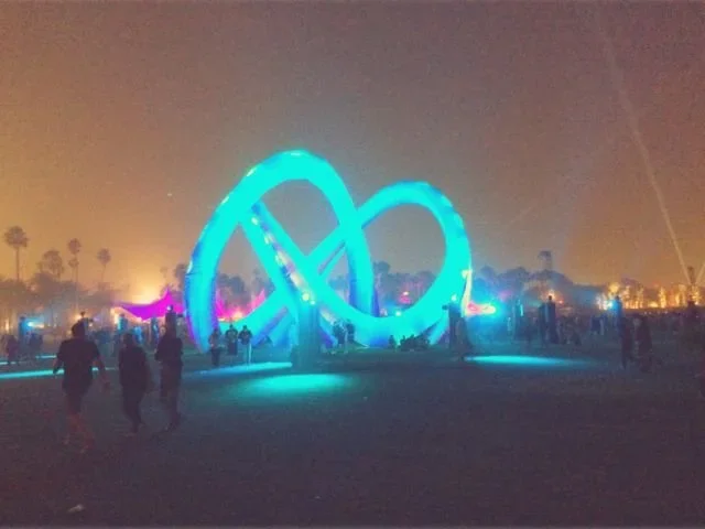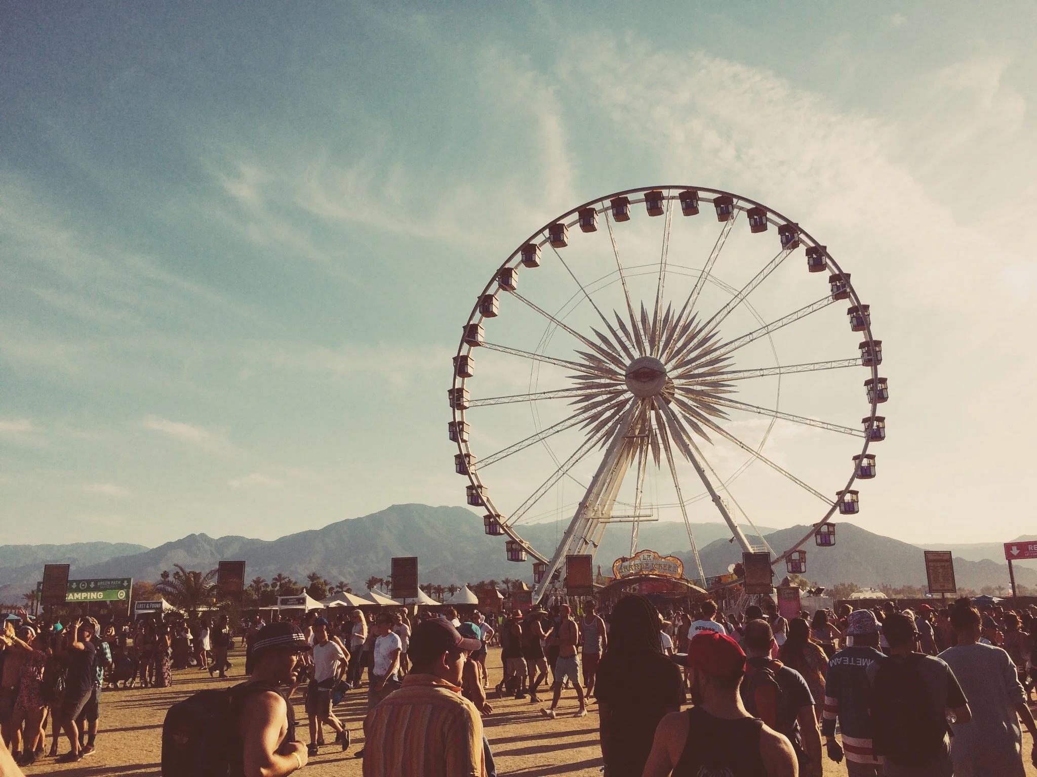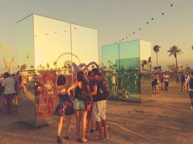More walking. Something wet hits my face. A girl, skipping a few feet ahead of her friends, is blowing bubbles from an oversized wand. They shimmer and hang in the air, fat as tennis balls, before bursting at the touch of outstretched hands. I distractedly note the prevalence of English accents in the bits of conversation that reach me. Always so many British visitors to Coachella. I wonder with envy how many of them will be at Glastonbury.