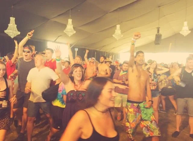 As the bluegrass notes wash over us, in the sandy area that divides the standers from the sitters, I'm physically unable to stay still. I jump up to dance while Greg remains seated, chatting with our neighbor on the ground. They talk about psychology and other randomness, passing a joint back and forth, happily crossed-legged on the ground despite the fact that everyone else around them is on his or her feet. I touch the back of Greg’s neck every few seconds as I dance, both to keep my bearings and to connect with him. He smiles up at me, telling me how much he loves the moment, the experience, me. It's an intense joy for both of us, that lasts song after song after song. When the opening strings of Wait So Long hit the air, everyone goes wild. Greg leaps to his feet, then kneels and pulls me atop his shoulders, where I stay for the duration of the song. He bounces and sways, holding my legs tight as we both belt out the words we know and love by heart. I dip my head and kiss his face, upside down. From my vantage point I see the hundreds of frenetic, ecstatic people singing along with us. The lights are synched perfectly to the tune, and our senses are saturated in every way possible. We leave the show electrified, and stay that way for the next three days.
