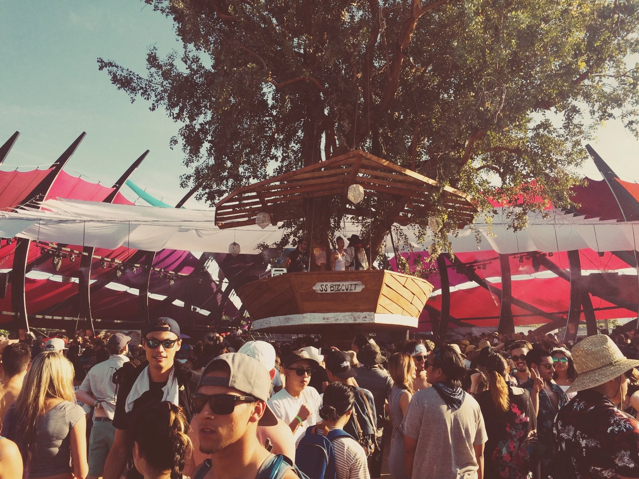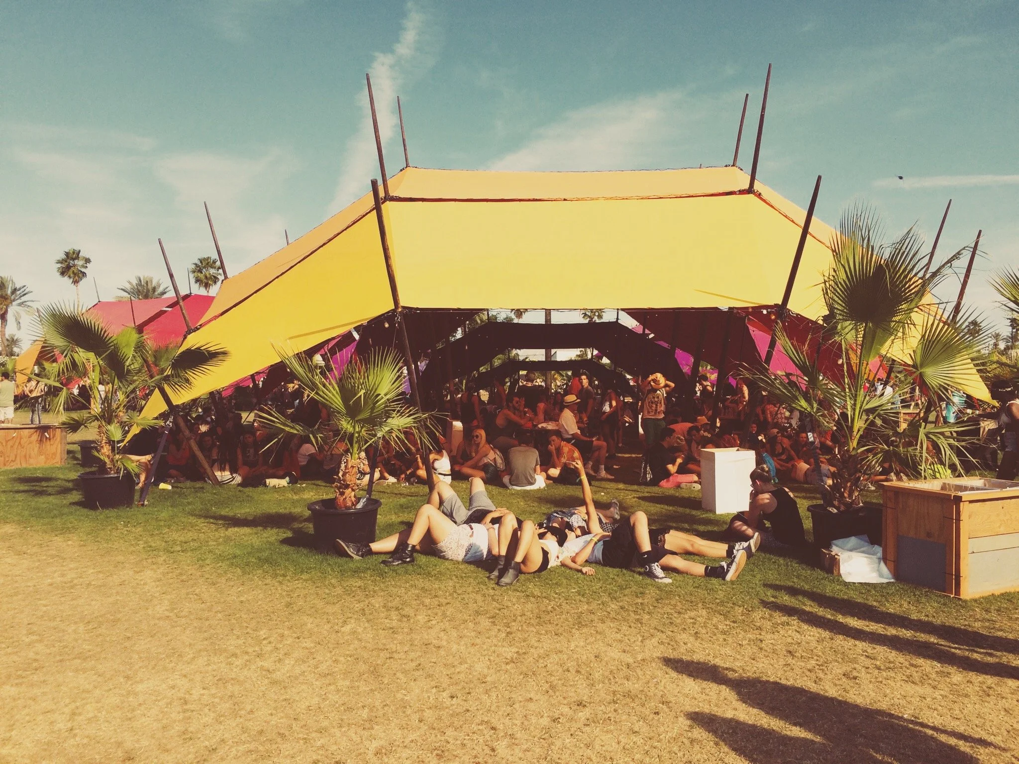 Sahara is relatively empty. This time of the day, sunlight beams straight inside, pressing brutally on shoulders and cheeks that have already seen too much of it over the weekend. But as always, the sound is irresistible, and under the huge, hangar-shaped dome whose framework is covered in speakers and lights, the die-hards dance. I've come here first on purpose, to soak up some of their vibe. My favorite tent, Sahara is where you go to be shamelessly joyous, to jump and laugh and dance alongside strangers who don't give a shit how well you do it. Some engage communally: millennials who giddily sing to one another familiar refrains of chart-topping EDM songs. Some are lost in themselves, watching their own frantic feet try to catch the beat.