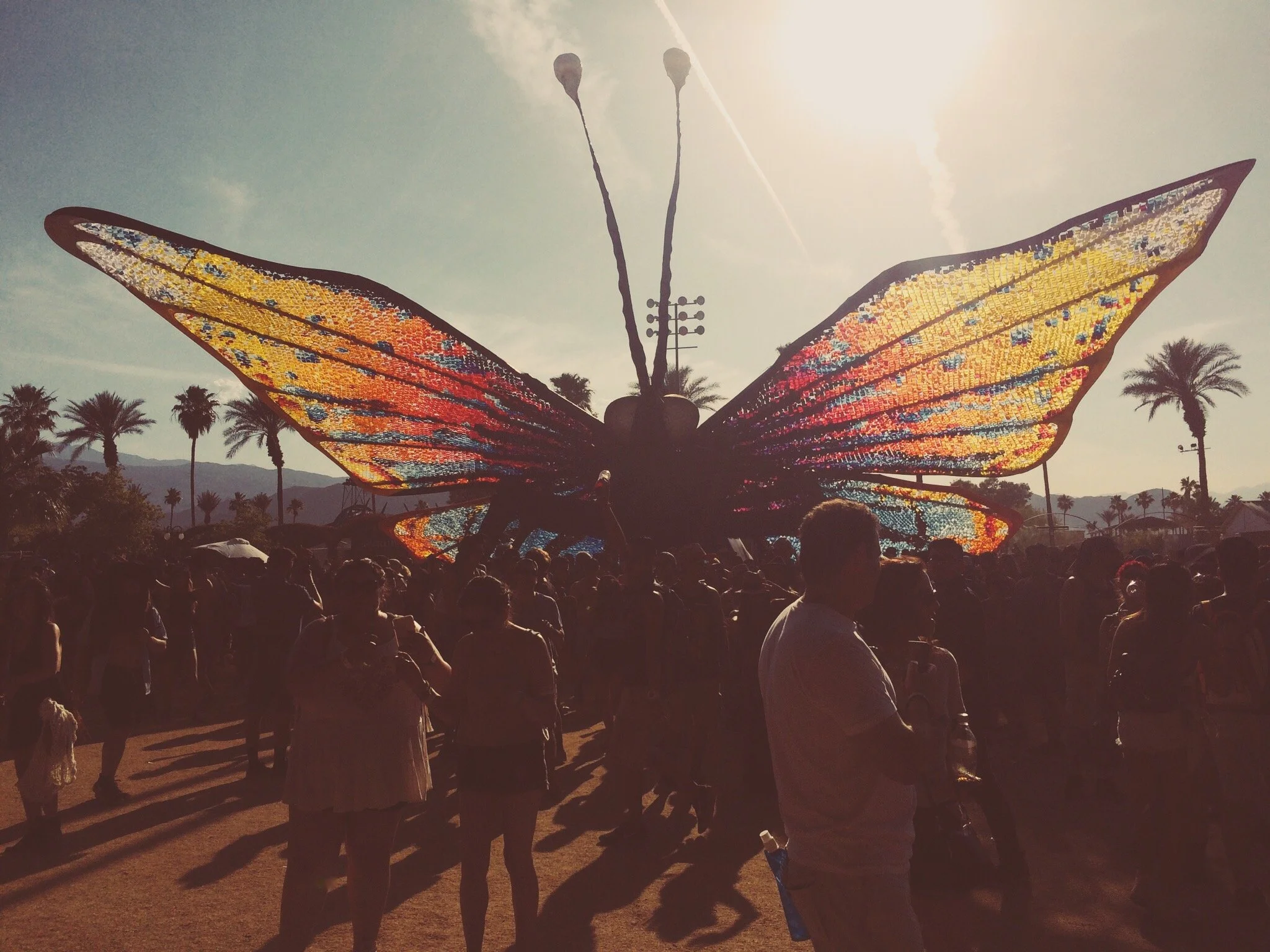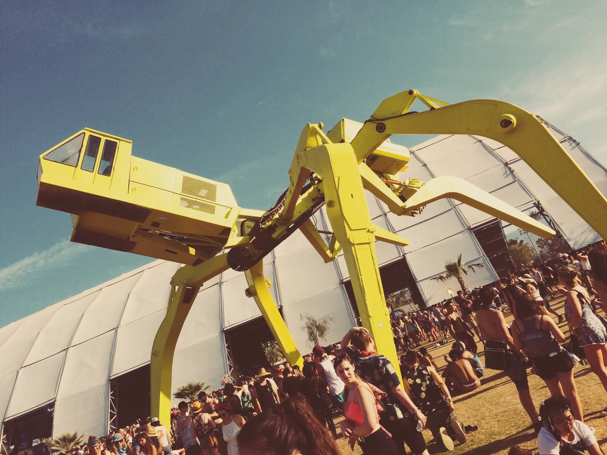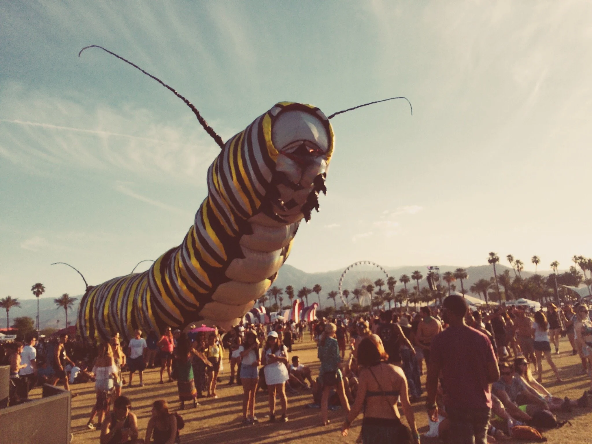 I buy two bottles of water, wiping them dry before dropping them into my backpack, and a peach smoothie, which I suck down in the five minutes it takes me to walk the long way around to the Sahara tent. I'd peeked at the app the night before, so I already knew a couple of the art installations, but I wanted to see them up close anyway. Stupid of me to have looked. Coachella doesn't hold that many surprises and whatever form the main structure takes every year is one of them. This season it's a caterpillar, reared up so its segmented belly and legs are exposed. Four stories high, yellow and black stripes, spindly antennae askew on its head. Creepy and wonderful.