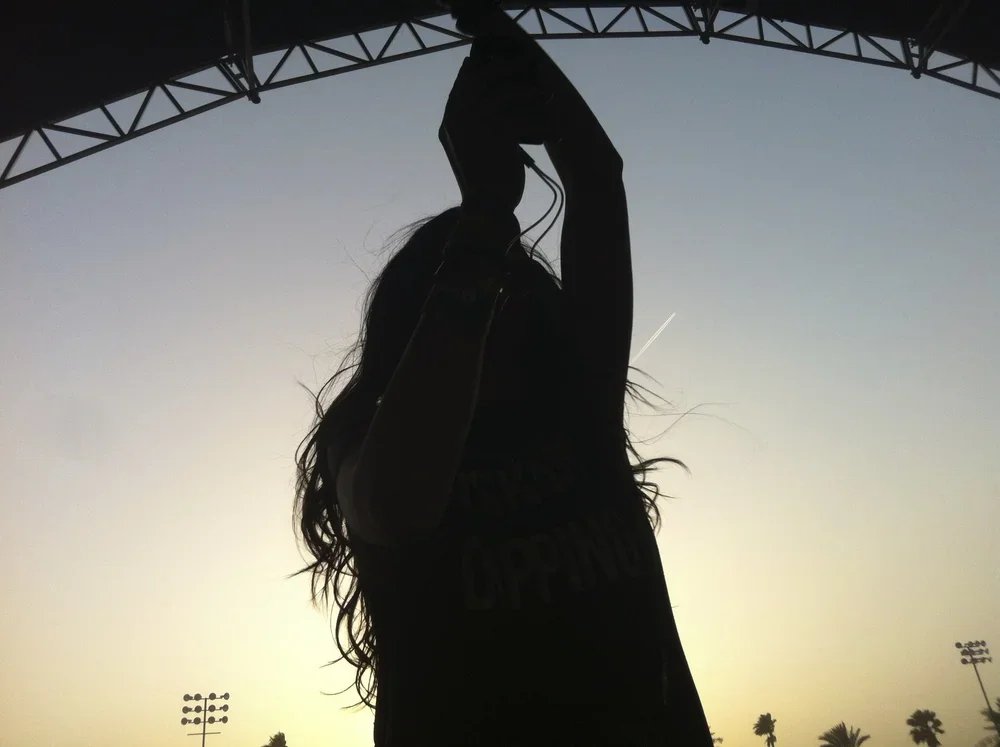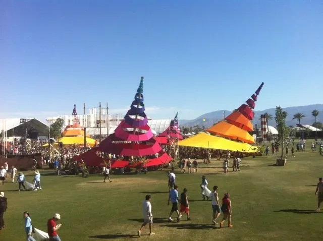 Full of smoothie, still getting my festival legs, I move a little bit but mostly just watch and listen. The tent starts to fill up, kids in scraps of clothing are bounding in by the dozen, high-fiving and hugging when they recognize one another. A girl with blonde hair twisted into corn rows bounces around playfully with her friends; they all bear the beat-up, sunburned, happily exhausted look of campers. The girl's glassy expression and slight stumble give her away: she's wasted. A tap on her shoulder; she turns to greet a shirtless coed with wavy, jaw-length hair that looks expensively cut. He's doesn't say anything, just gives her a sheepish look that she returns with a wordless hug. The way they hang on one another, swaying for several second with her arms tight around his neck and his hands lightly on her back, suggests longtime friendship. I imagine endless late night talks in dorm rooms. Gossip and secrets. Deep platonic affection. He starts to speak but she puts a finger to his lips, shushing, shaking her head. Her lips are easy to read: It's okay. I love you. The drunken drama of the scene would be comical at a bar but for some reason, here the moment is unspeakably sweet. The pair has obviously had a big fight, maybe one that lasted all weekend, maybe something that embroiled their friends (who are watching and smiling approvingly) and cast a pall over the whole party. But now, on the last day, buoyed by friendship and a soundtrack that will squeeze their hearts every time they hear it—they are making up. This is Coachella.