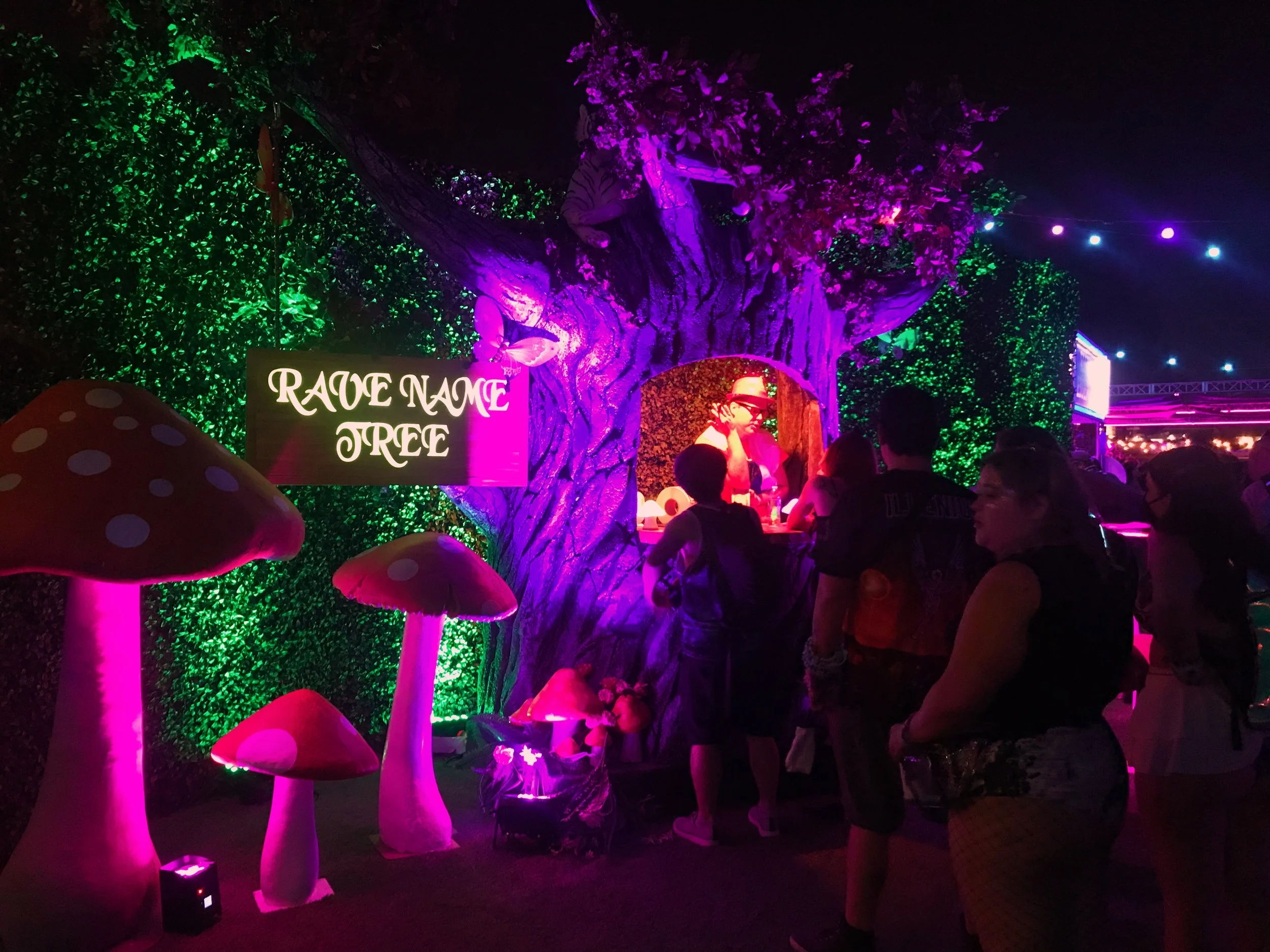 It leveled out. But I was still cold and overly high, and desperately needed to dance it off. Only that was impossible because of the stupid hill we were situated on. I found a little spot off to the side where I could set my bag down under a big tree-sized glowing mushroom (so meta!), and that worked okay except for the fact that people kept coming up and asking if I'd take their photo under the mushroom. I was like Yo I can barely see this dimension much less your tiny phone screen but let's do this.