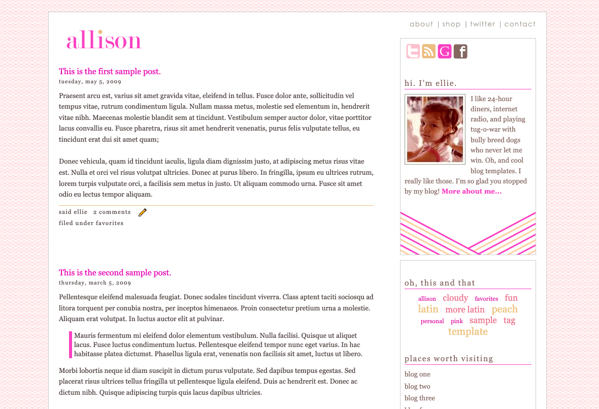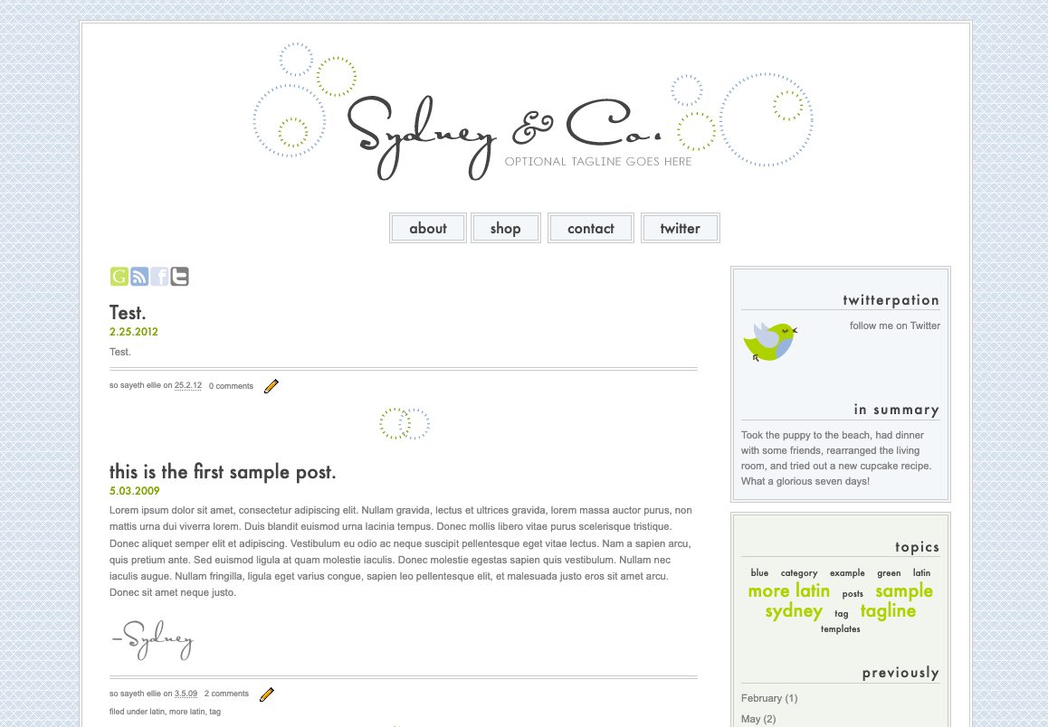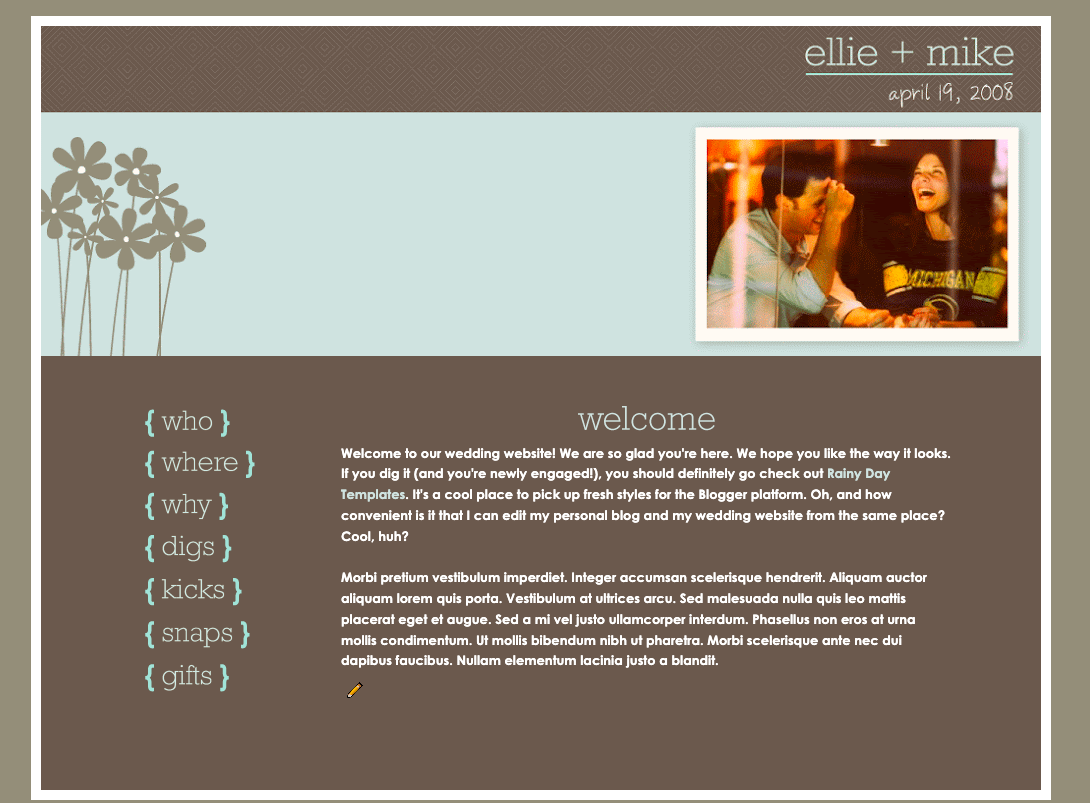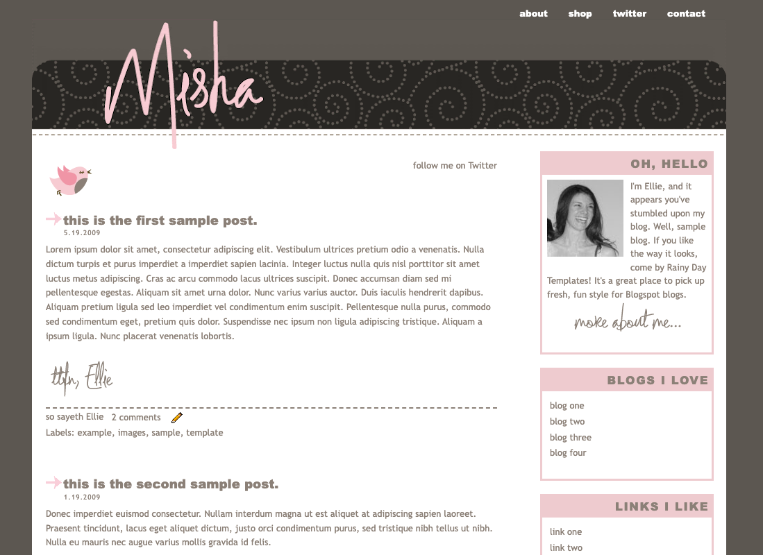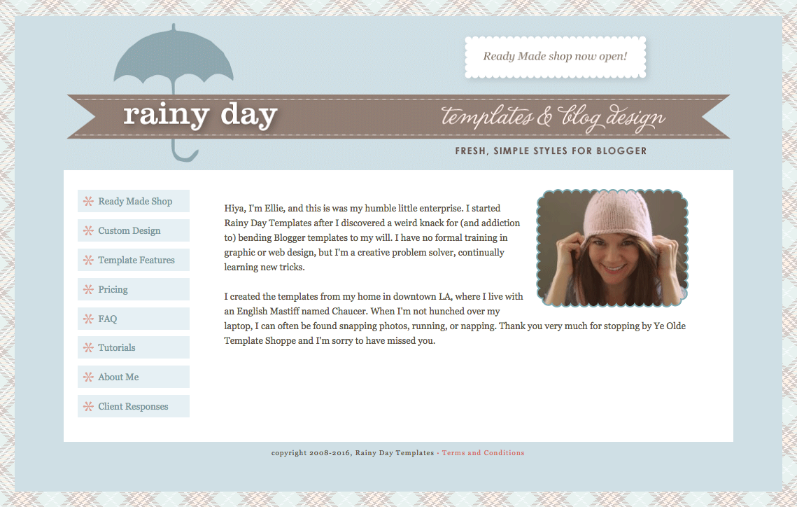 Here are some of the premade templates I designed for personal blogs, photography blogs, wedding websites, and even a simple Blogger-based shop (all SUPER dated, but cut me some slack—it was 2009):