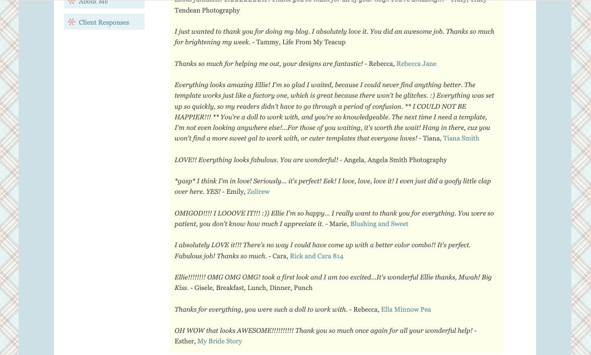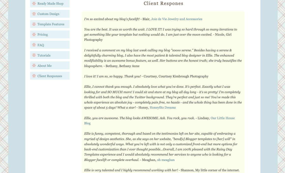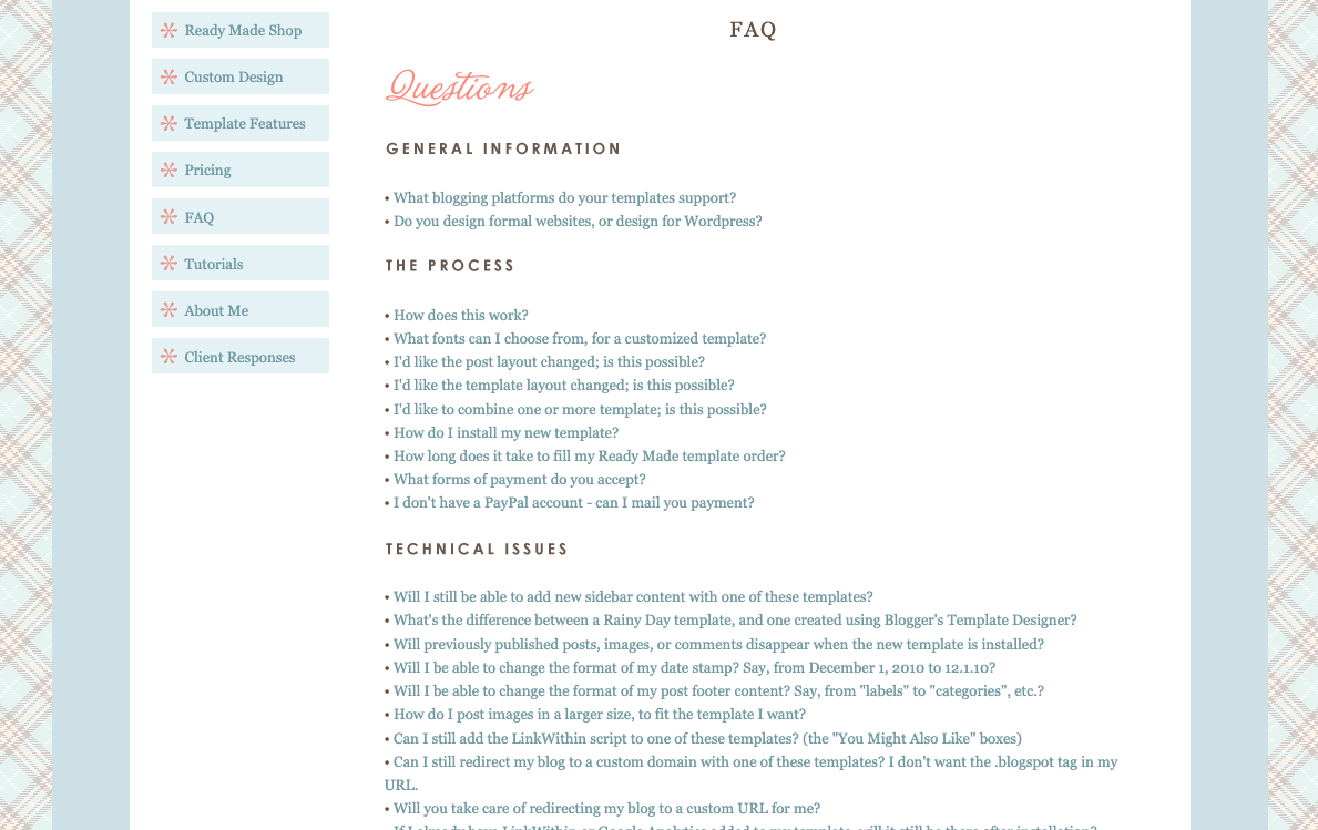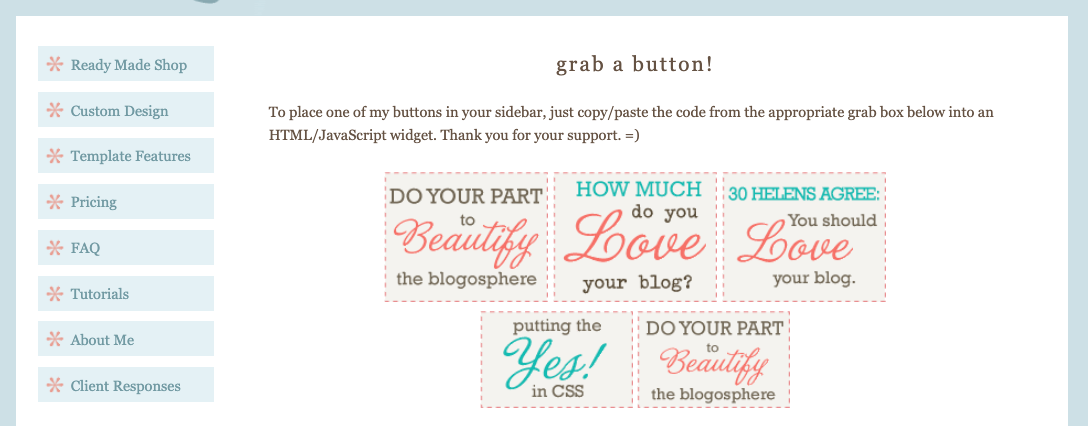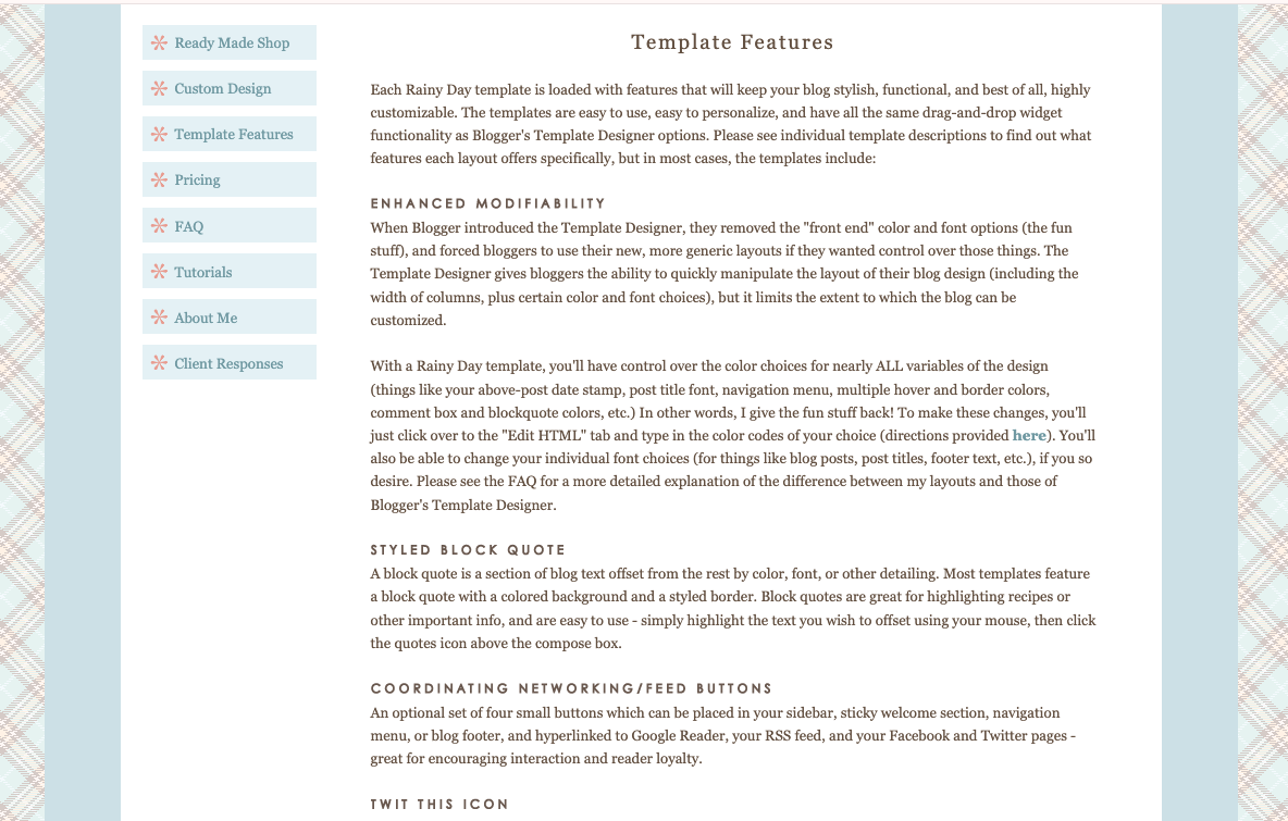 Rainy Day was my whole world for a while. I was so super excited to wake up each day and see what orders had come in. I worked so hard to build out the purchase process as simplified and clear as possible. I provided tons of tutorials so people could continue to customize their blogs themselves and offered lifetime (lol) support & background hosting (Photobucket FTW). I had pattern libraries, FAQs, even buttons you could put in your sidebar to support my shop.