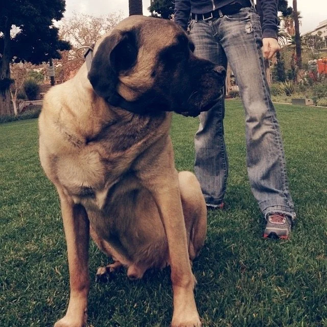 On the way out a man in a faded black sweatshirt, plaid dress pants, and no shoes stops us. "That a mastiff?" Sure is, I tell him. "How old?" Chaucer ambles by him unbothered, concentrating on something in the grass.
