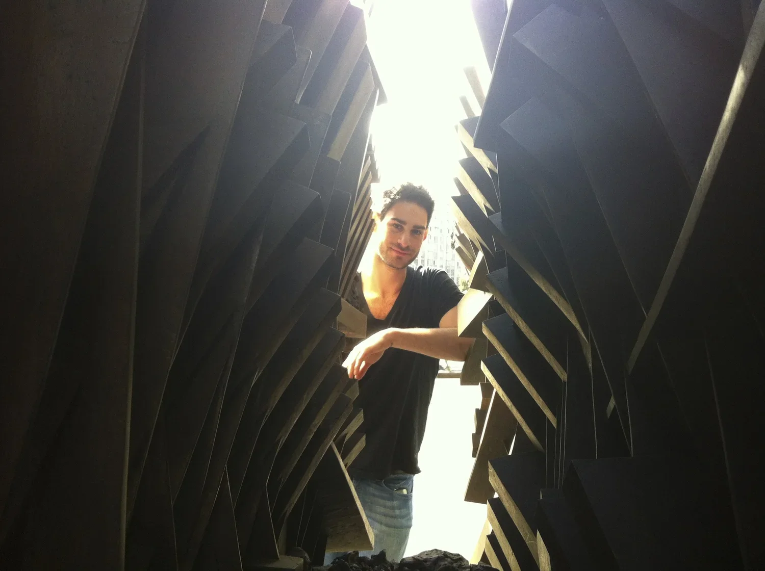 Late night on a weekend, in the lobby of my building. I'm waiting for the elevator, which has been slow all day. He walks in the front door, says hello, and positions himself in front of the other elevator. He glances over at me, then up at the floor indicator above my elevator, then at the indicator above his own. "I'm going to win," he says. I'm tipsy from being out all night. I look over and narrow my eyes: challenge accepted. A few moments of silence while we wait and watch. Ding! He spreads his hands and smiles. See? I laugh, and we step into his elevator together. He relaxes against the wall, and I mirror him on the opposite side.